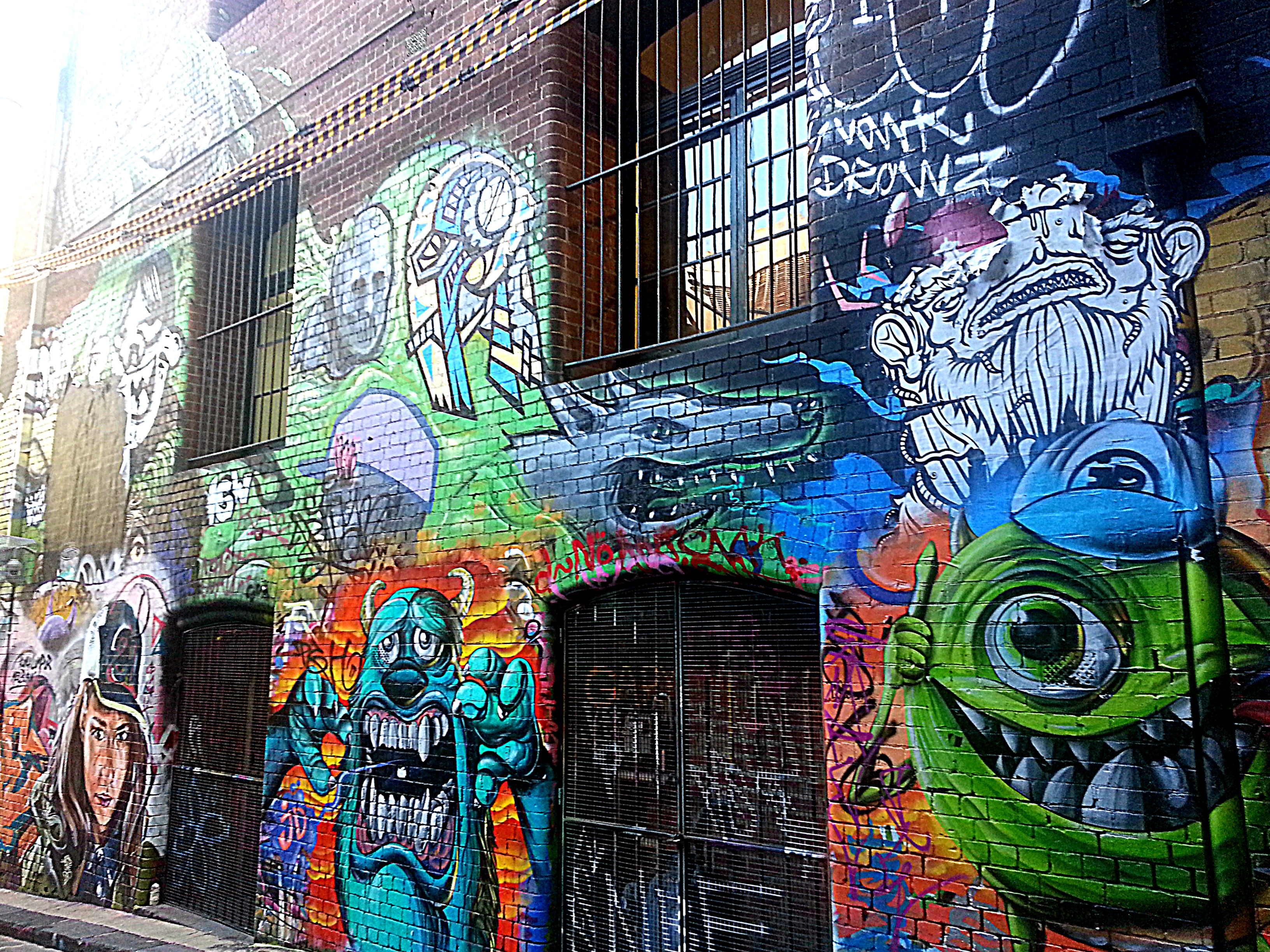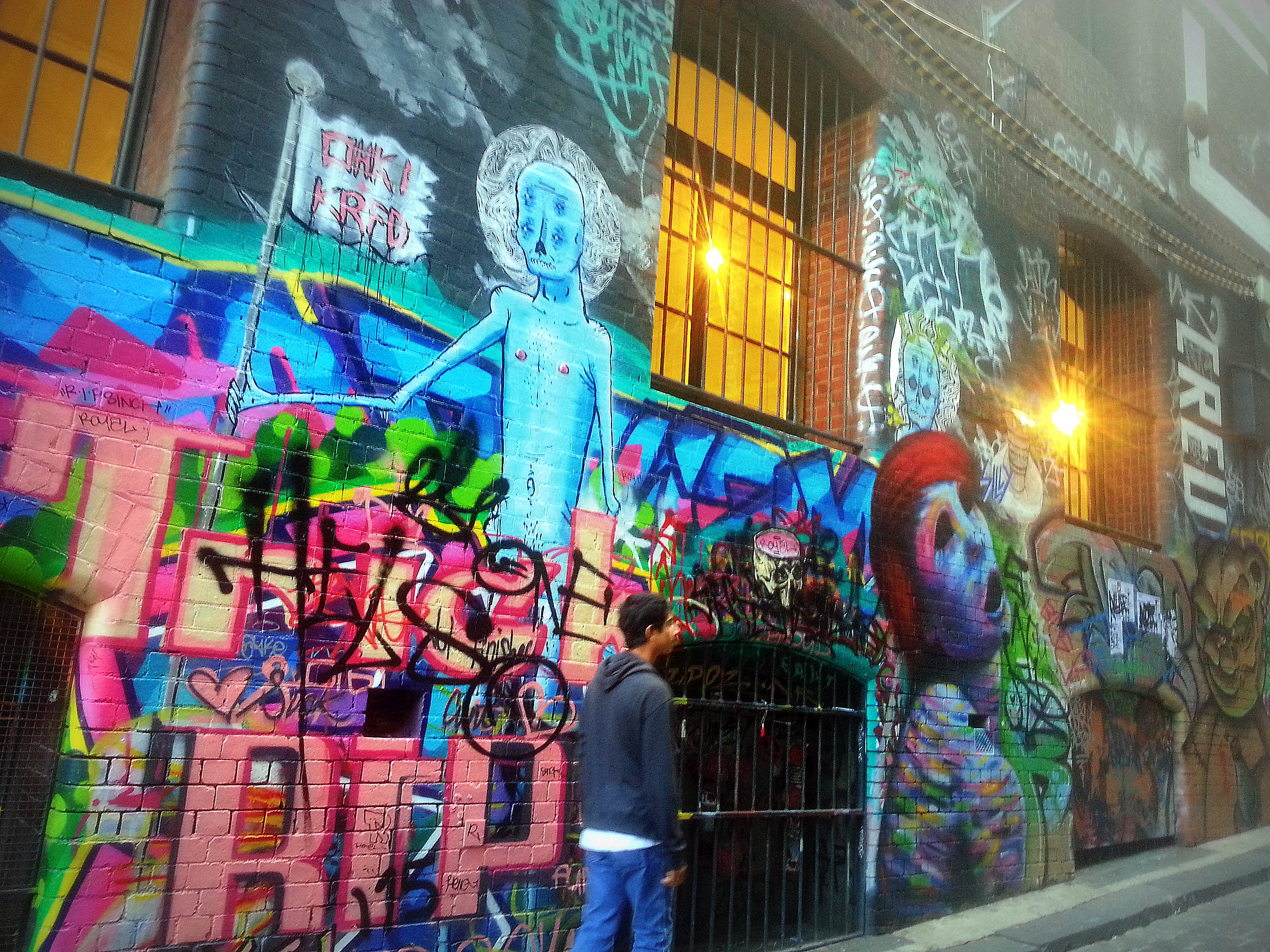 Just behind Fed Square, right past Movida(in pic above) you can enter Hosier Lane which horse-shoes into Rutledge Lane and together these cobbled laneways lay witness to one of the densest collections of street anywhere in the world. Graffiti can be political to counter cultural laced with irreverent humour. I don’t and cannot interpret them too much being new to the place and the culture and so on,but for sure they are visually spectacular. And below are a few images I managed to capture bypassing other droves of camera-wielding folks clicking away.